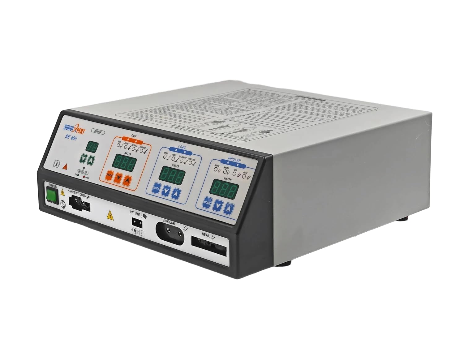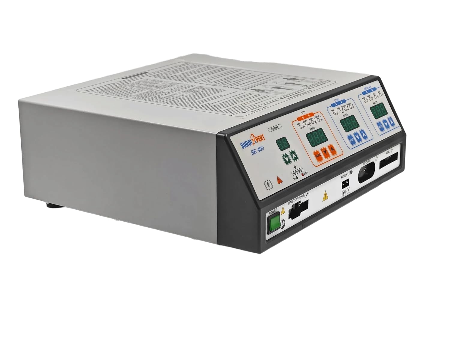 The SurgiXpert SE-400 Cautery Machine is a professional electrosurgical generator designed for use in hospitals and surgical centers. With a 400W output, it supports vessel sealing, cutting, and coagulation functions, providing reliable performance for surgical procedures.